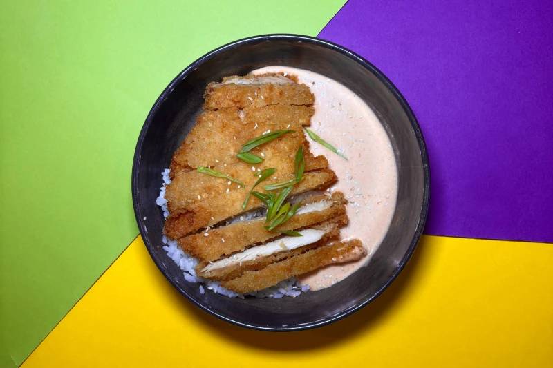 Состав: Куриное бедро, соус Краб, кляр, сухари Панко, рис, кунжут, соус Том Ям